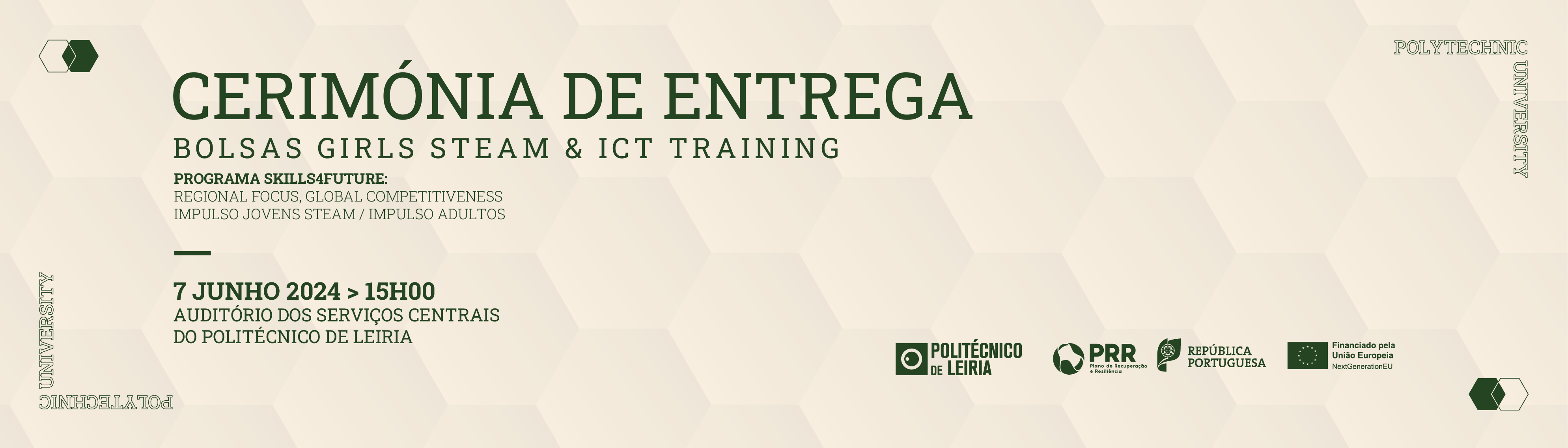 A 7 de junho, pelas 15h00, o Instituto Politécnico de Leiria promove a cerimónia de entrega das bolsas ‘GIRLS STEAM’ e ‘ICT TRAINING’, no âmbito do projeto ‘Skills4Future: Regional Focus, Global Competitiveness – Impulso Jovens STEAM / Impulso Adultos’. O evento realiza-se no auditório dos Serviços Centrais, com a presença da subdiretora-geral do Ensino Superior (DGES), Ângela Noiva Gonçalves.