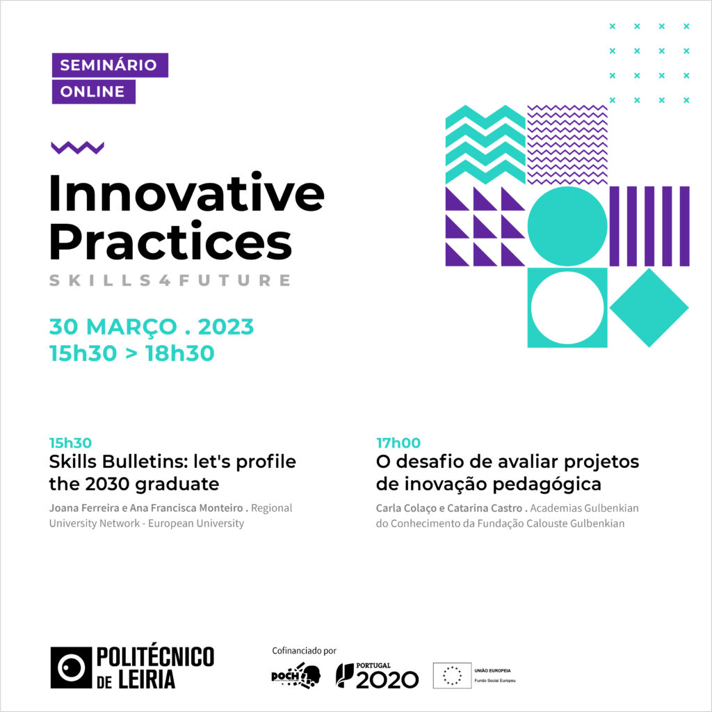 O Politécnico de Leiria, em colaboração com a Unidade de Ensino a Distância, organiza o 1º encontro do Projeto SKILLS4FUTURE: INNOVATIVE PRACTICES, com o objetivo de apresentar as linhas de trabalho do projeto e convidar todos os professores à sua participação. Neste evento, convidamos a Professora Doutora Paula Peres (Instituto Politécnico do Porto) para nos falar sobre a inovação pedagógica no Ensino Superior.