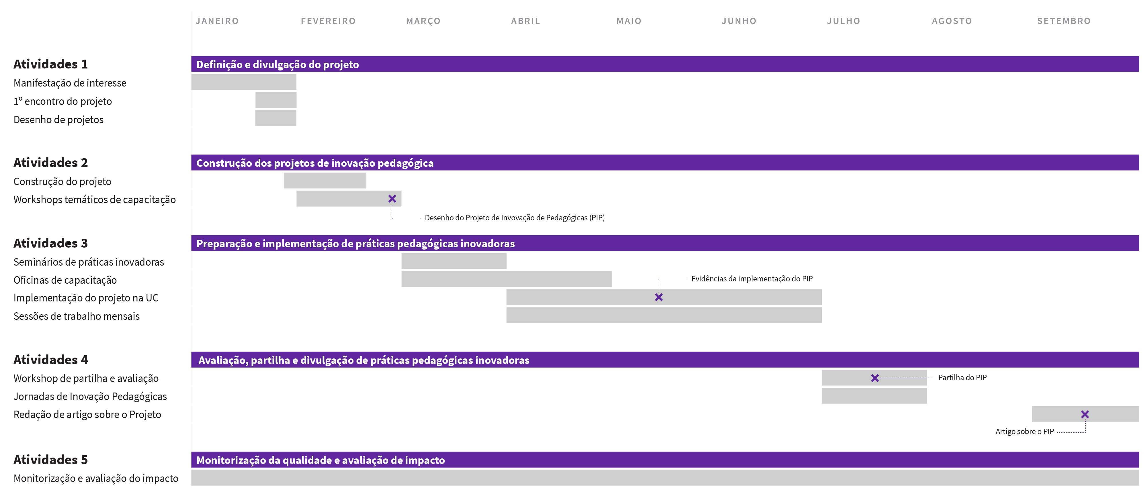 Este projeto encontra-se organizado em 5 atividades distintas, que poderão englobar seminários, workshops, sessões de trabalho, partilhas de práticas, entre outros eventos, divulgados no site do projeto.