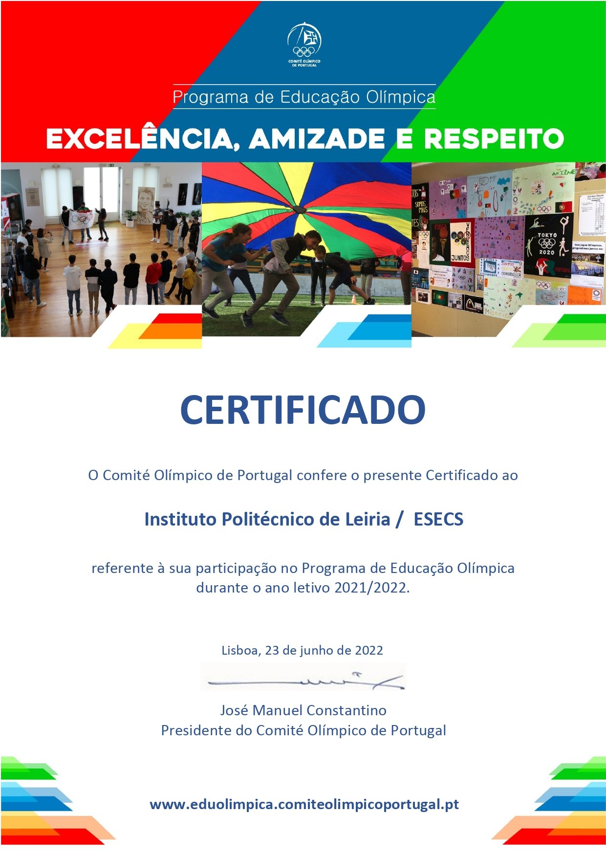 O Comité Olímpico de Portugal atribuiu ao Politécnico de Leiria um certificado pela sua participação no Programa de Educação Olímpica, durante o ano letivo 2021/2022. O certificado foi atribuído ao Politécnico de Leiria, através da Escola Superior de Educação e Ciências Sociais (ESECS), pelo trabalho contínuo que tem vindo a ser desenvolvido no âmbito da Educação Olímpica, que se traduziu na realização de iniciativas a propósito desta temática, nomeadamente aulas abertas, formação contínua, ações da ética desportiva, entre outras.