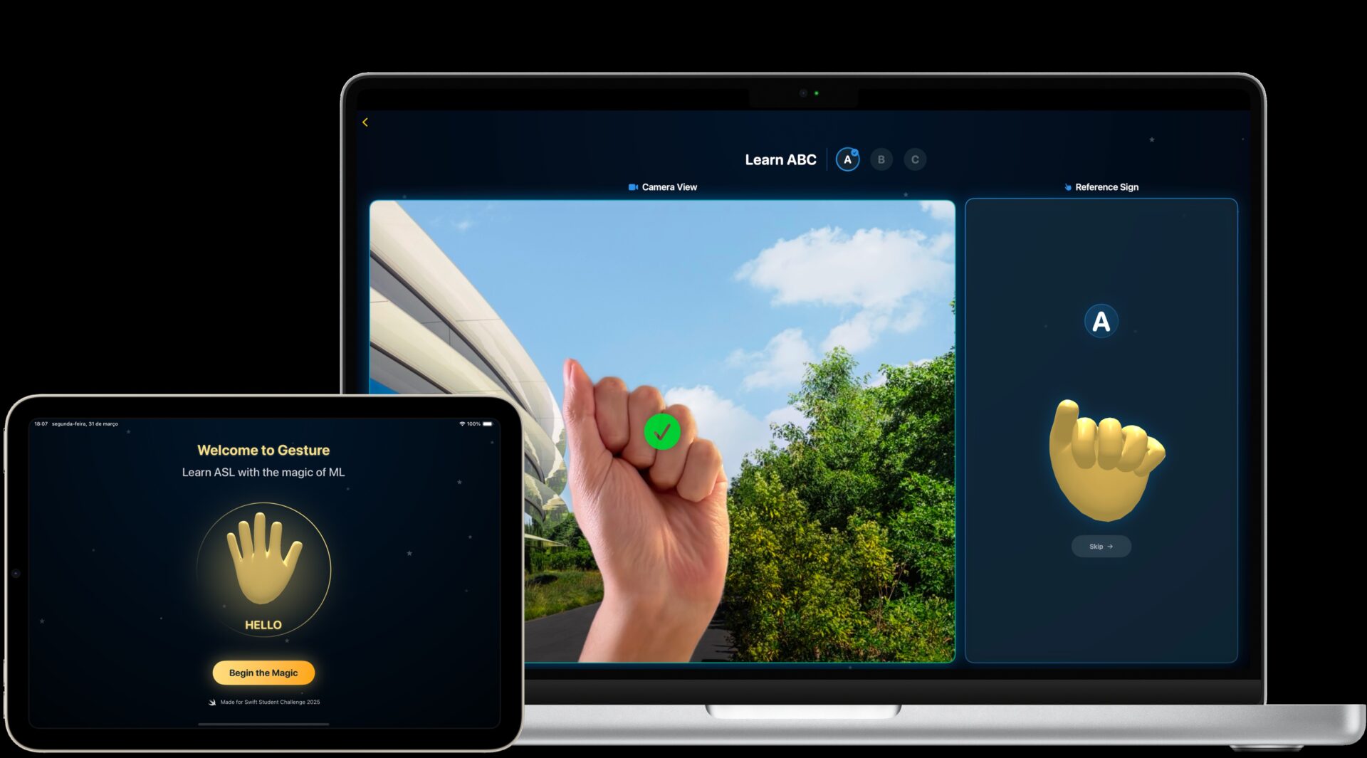 ‘Gesture’ é o nome da aplicação que, utilizando aprendizagem automática e modelos 3D interativos, permite aos utilizadores aprenderem e praticarem língua gestual americana, com feedback em tempo real. A aplicação utiliza o modelo 3D da mão para guiar o utilizador nos gestos, permitindo que o sistema reconheça as imitações e forneça o feedback adequado de forma interativa e divertida.