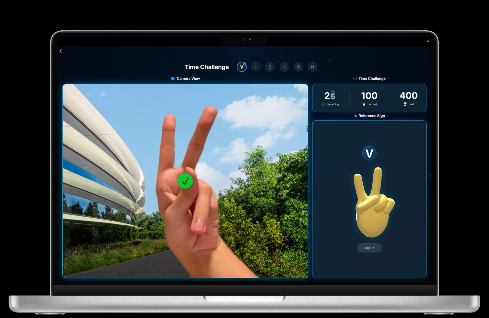 Para apoiar os principiantes em ASL, a aplicação inclui dois níveis específicos para a prática da soletração. O primeiro nível é focado nas letras ‘ABC’, enquanto o segundo permite praticar a palavra ‘Swift’. Esses níveis iniciais ajudam os utilizadores a dominar os fundamentos da soletração e a familiarizarem-se com a aplicação, antes de avançarem para gestos e palavras mais complexas.