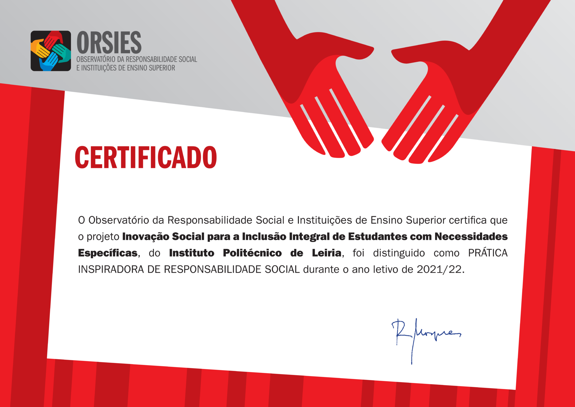 A 24 fevereiro 2023, no Auditório da Biblioteca Orlando Ribeiro, em Lisboa, por ocasião do “IV Encontro Nacional sobre Responsabilidade Social” organizado pelo Observatório de Responsabilidade Social (ORSIES), o projeto “Inovação Social para a Inclusão Integral de Estudantes com Necessidades Específicas” do Politécnico de Leiria foi distinguido com “Prática Inspiradora de Responsabilidade Social” (2021/2022).