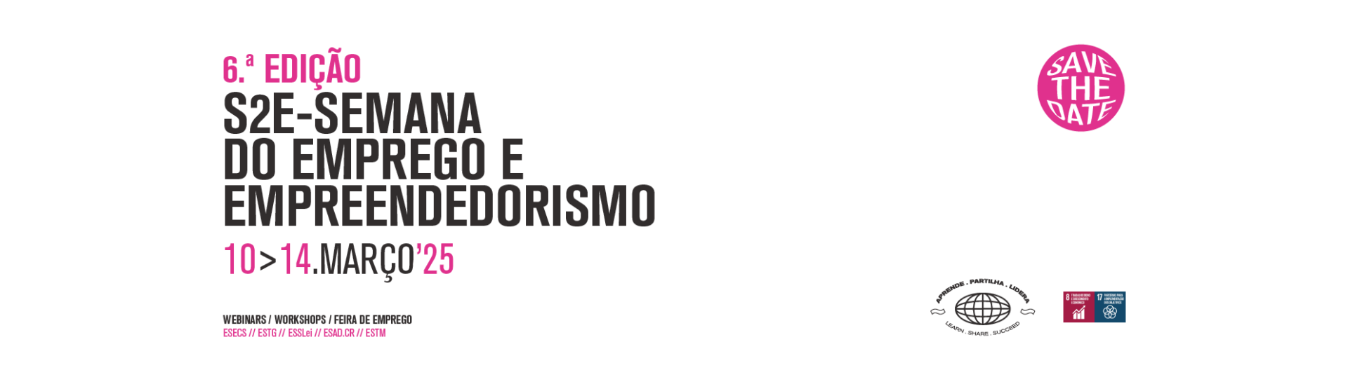 Entre os dias 10 e 14 de março de 2025, o Politécnico de Leiria promove a “S2E – Semana do Emprego e Empreendedorismo”, especialmente dirigida aos estudantes e alumni do IPLeiria.