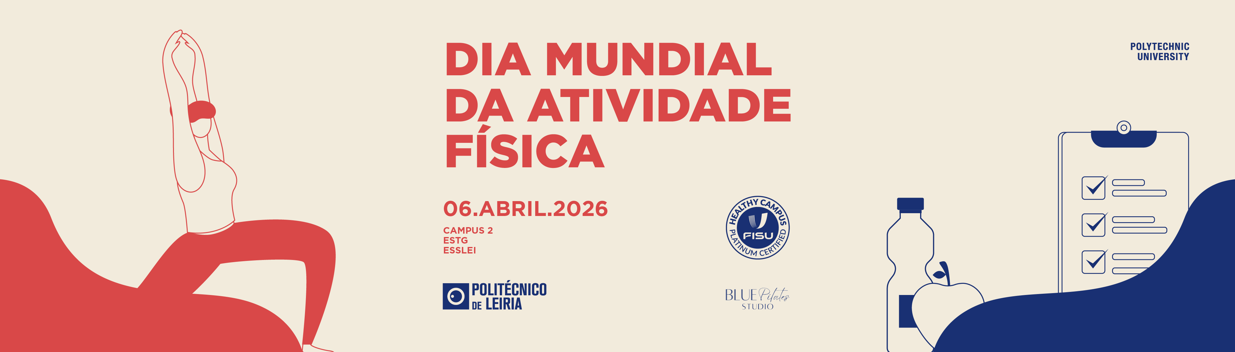 No âmbito das comemorações do Dia Mundial da Atividade Física, os Serviços de Ação Social do Politécnico de Leiria, através da Unidade de Desporto, Saúde e Bem-Estar (UDSBE), promovem, no próximo dia 6 de abril de 2026 (segunda-feira), um conjunto de iniciativas focadas na promoção da atividade física, do bem-estar e de hábitos de vida saudáveis.