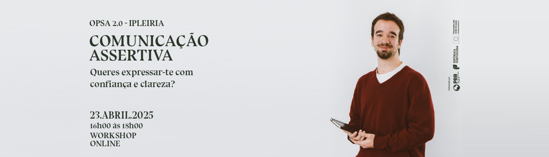 » A próxima ação será no dia 23 de Abril, das 16h00 às 18h00, em formato online, com o tema: “COMUNICAÇÃO ASSERTIVA”. Neste Workshop irás aprender a transmitir as tuas ideias de forma eficaz, sem receios e com respeito pelos outros. Descobre técnicas para melhorar a tua assertividade, evitar conflitos e fortalecer as tuas relações pessoais e profissionais.